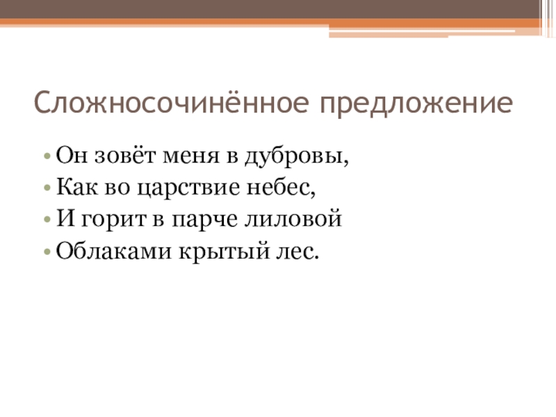 Сложносочинённое предложениеОн зовёт меня в дубровы,Как во царствие небес,И горит в парче лиловойОблаками крытый лес.