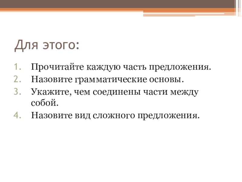 Для этого:Прочитайте каждую часть предложения.Назовите грамматические основы.Укажите, чем соединены части между собой.Назовите вид сложного предложения.
