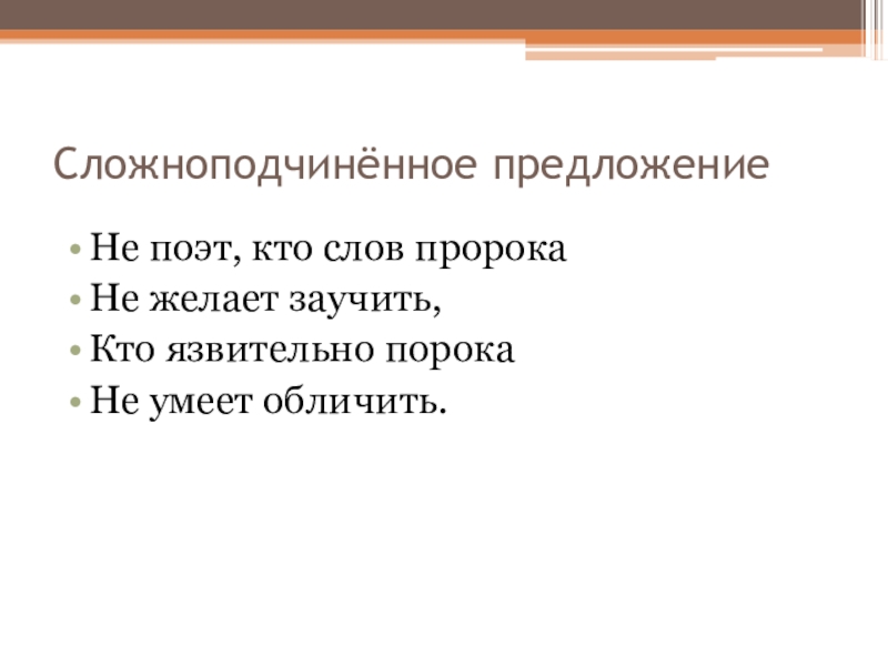 Сложноподчинённое предложениеНе поэт, кто слов пророкаНе желает заучить,Кто язвительно порокаНе умеет обличить.