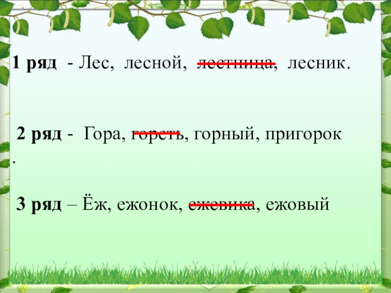 1 ряд - Лес, лесной, лестница, лесник. 2 ряд - Гора, гореть, горный, пригорок. 3 ряд –