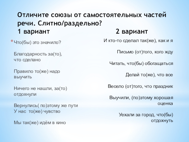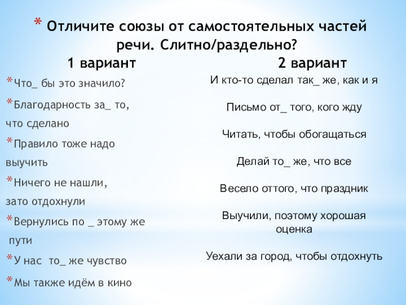 Отличите союзы от самостоятельных частей речи. Слитно/раздельно?