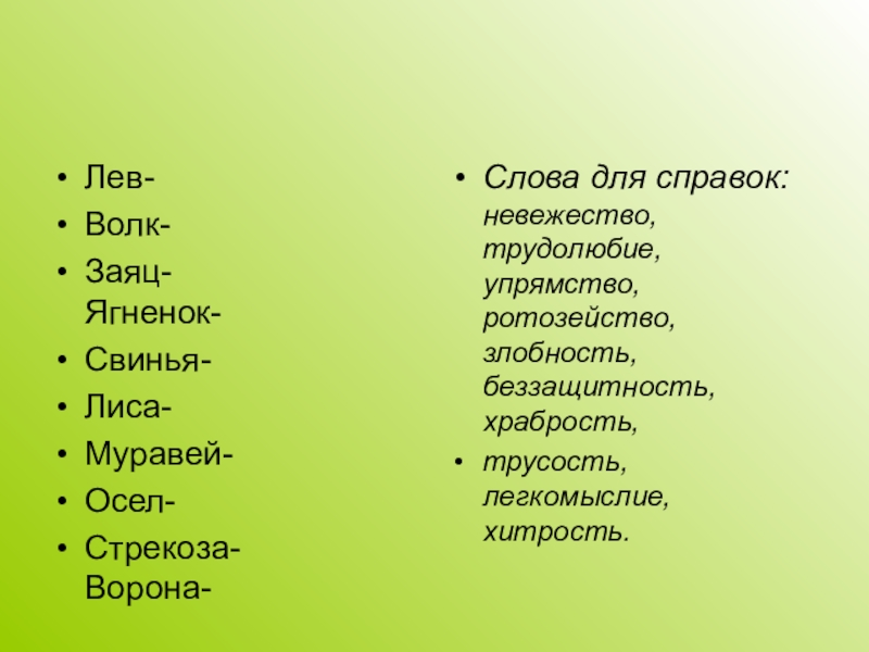 Слова для справок: невежество, трудолюбие, упрямство, ротозейство, злобность, беззащитность, храбрость,