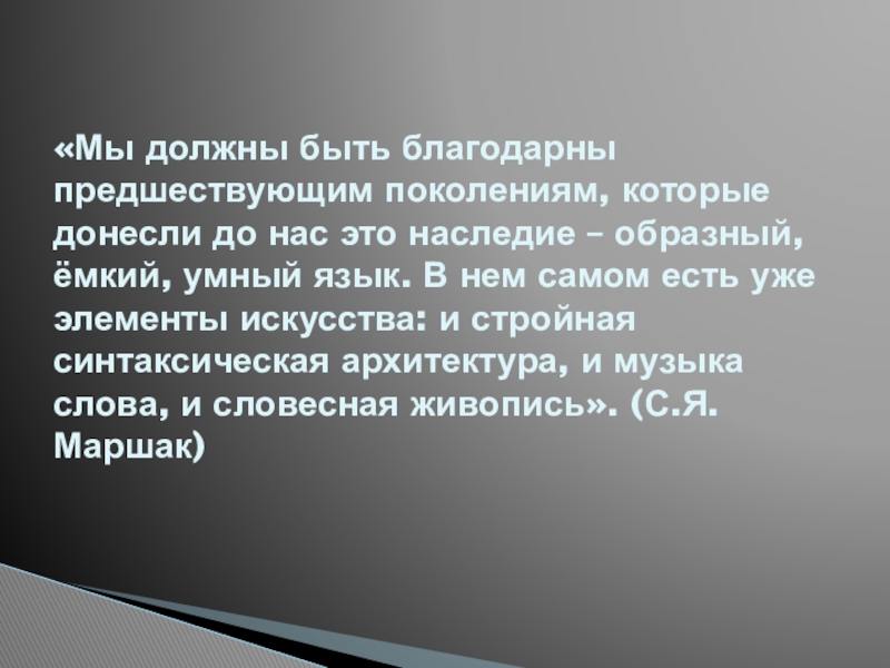 наследие – образный, ёмкий, умный язык. В нем самом есть уже элементы искусства: и стройная синтаксическая архитектура, и музыка слова, и словесная живопись». (С.Я.Маршак)