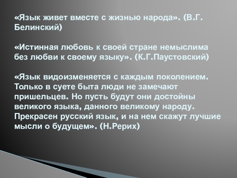 «Язык видоизменяется с каждым поколением. Только в суете быта люди не замечают пришельцев. Но пусть будут они достойны великого языка, данного великому народу. Прекрасен русский язык, и на нем скажут лучшие мысли о будущем». (Н.Рерих)