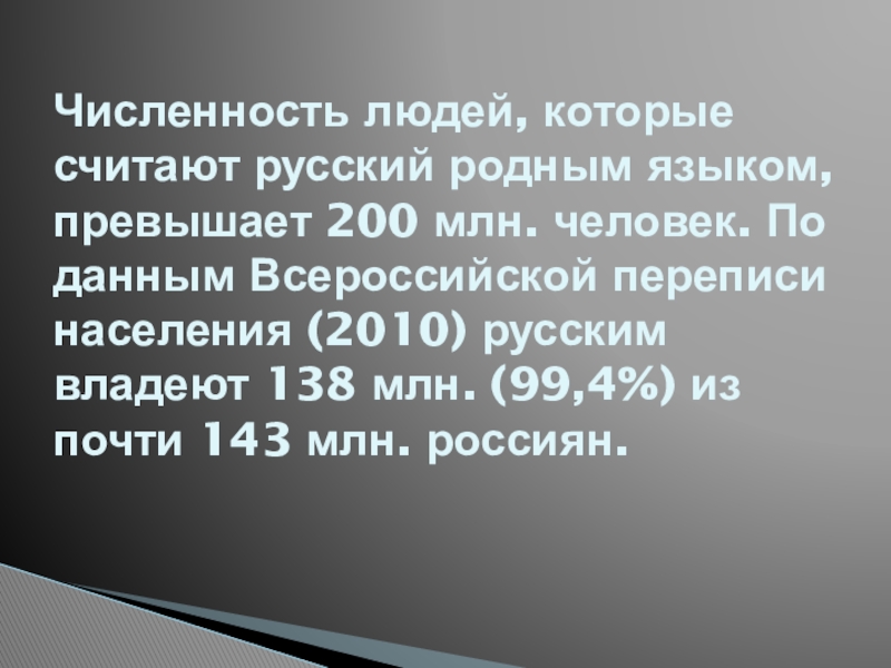 Численность людей, которые считают русский родным языком, превышает 200 млн. человек.