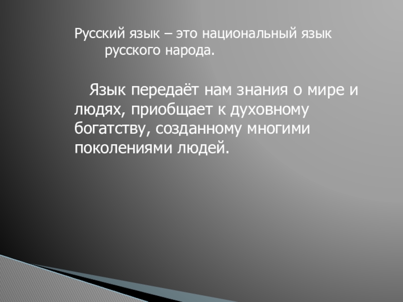 Язык передаёт нам знания о мире и людях, приобщает к духовному богатству, созданному многими поколениями людей.