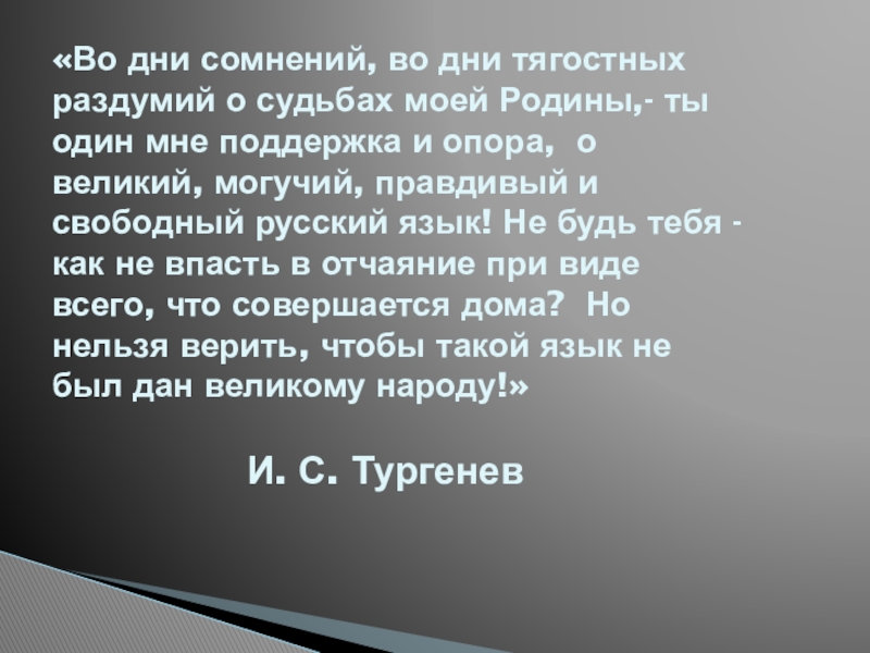 ты один мне поддержка и опора, о великий, могучий, правдивый и свободный русский язык! Не будь тебя - как не впасть в отчаяние при виде всего, что совершается дома? Но нельзя верить, чтобы такой язык не был дан великому народу!»