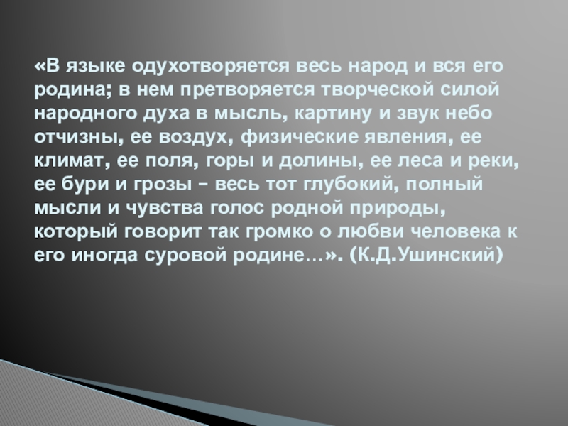 претворяется творческой силой народного духа в мысль, картину и звук небо отчизны, ее воздух, физические явления, ее климат, ее поля, горы и долины, ее леса и реки, ее бури и грозы – весь тот глубокий, полный мысли и чувства голос родной природы, который говорит так громко о любви человека к его иногда суровой родине…». (К.Д.Ушинский)