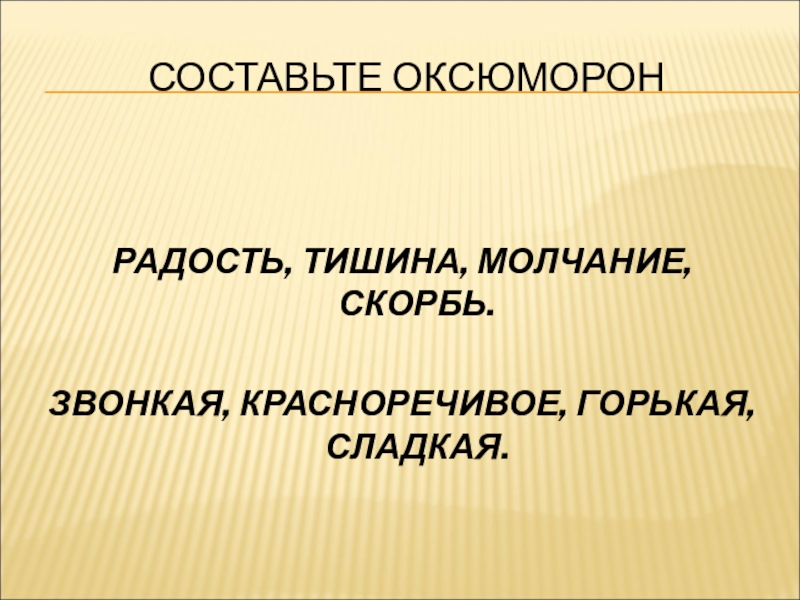 СОСТАВЬТЕ ОКСЮМОРОНРАДОСТЬ, ТИШИНА, МОЛЧАНИЕ, СКОРБЬ.ЗВОНКАЯ, КРАСНОРЕЧИВОЕ, ГОРЬКАЯ, СЛАДКАЯ.