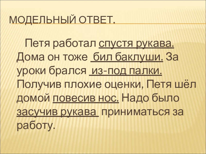 МОДЕЛЬНЫЙ ОТВЕТ.     Петя работал спустя рукава. Дома он тоже бил баклуши. За уроки