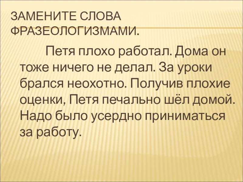 ЗАМЕНИТЕ СЛОВА ФРАЗЕОЛОГИЗМАМИ.      Петя плохо работал. Дома он тоже ничего не делал.