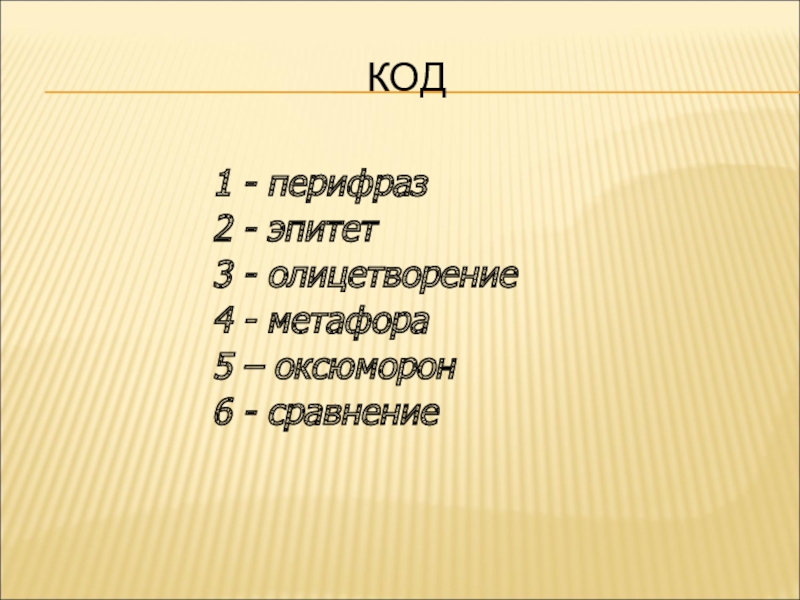 КОД1 - перифраз 2 - эпитет3 - олицетворение 4 - метафора5 – оксюморон6 - сравнение