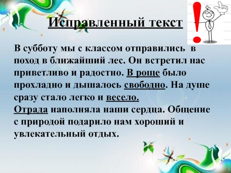 классом отправились в поход в ближайший лес. Он встретил нас приветливо и радостно. В лесу было прохладно и дышалось легко. На душе сразу стало легко и радостно. Радость наполняла наши сердца. Общение с природой подарило нам хороший и радостный отдых.