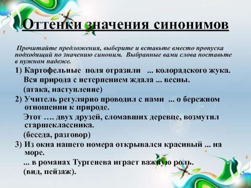 по значению синоним. Выбранные вами слова поставьте в нужном падеже.
