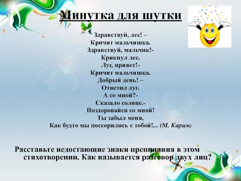 Расставьте недостающие знаки препинания в этом стихотворении. Как называется разговор двух лиц?