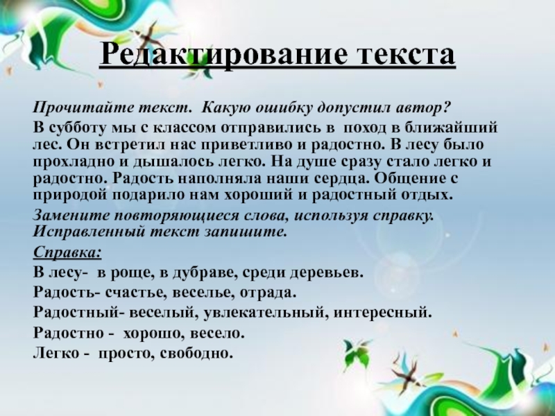 Замените повторяющиеся слова, используя справку. Исправленный текст запишите.