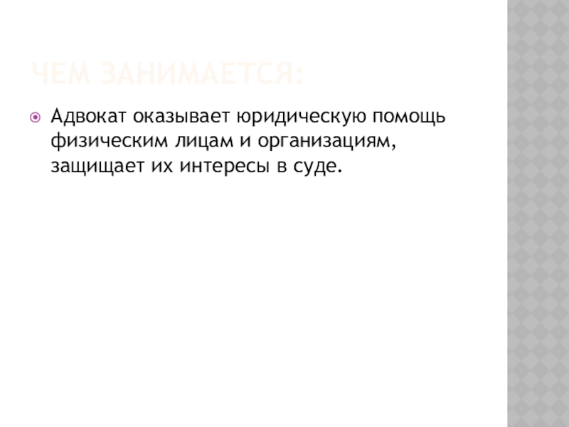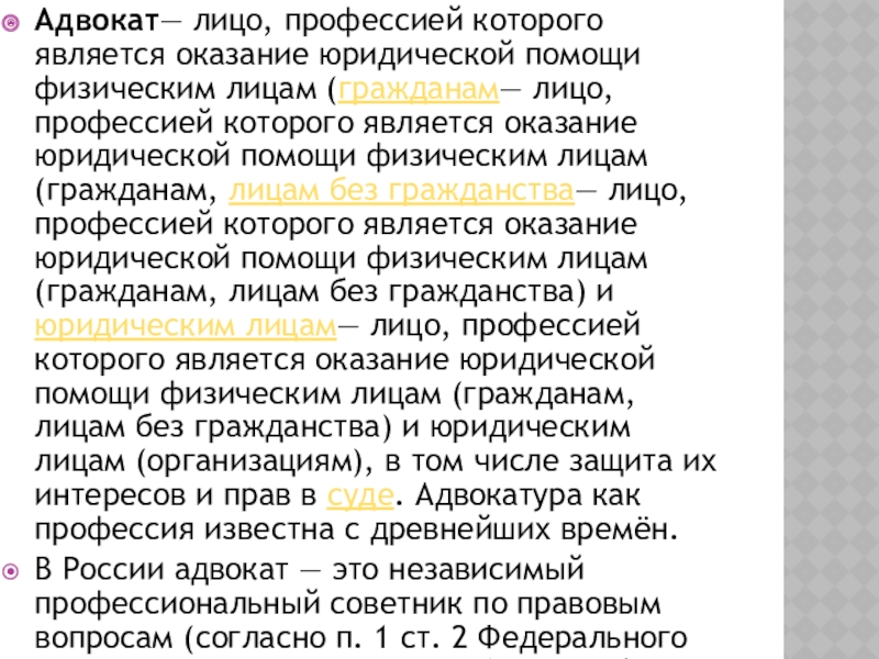 Слайд 2Адвокат— лицо, профессией которого является оказание юридической помощи физическим лицам (гражданам—