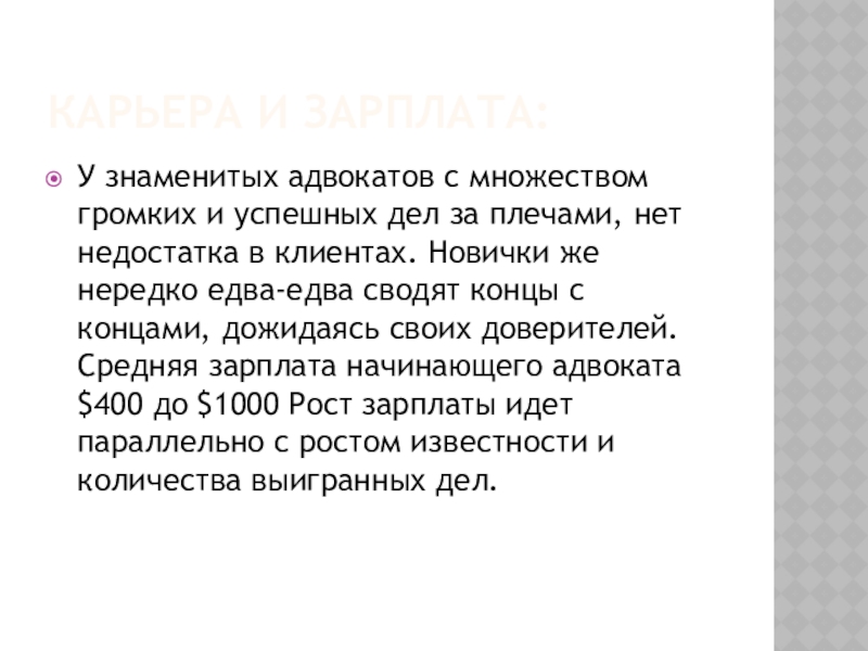 дел за плечами, нет недостатка в клиентах. Новички же нередко едва-едва сводят концы с концами, дожидаясь своих доверителей. Средняя зарплата начинающего адвоката $400 до $1000 Рост зарплаты идет параллельно с ростом известности и количества выигранных дел.