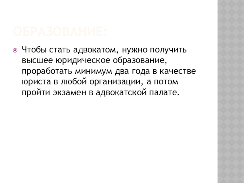 Чтобы стать адвокатом, нужно получить высшее юридическое образование, проработать минимум