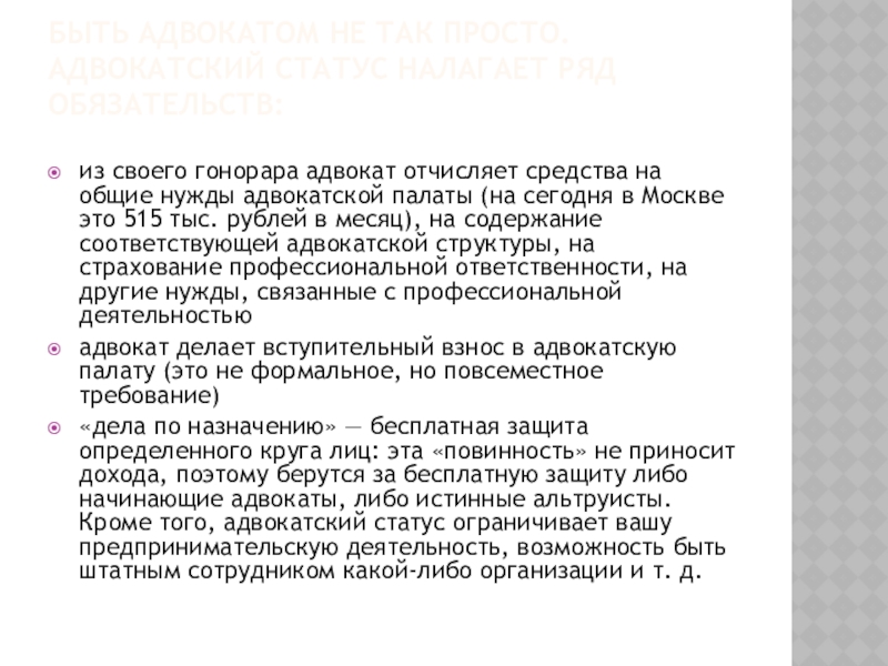 Слайд 6БЫТЬ АДВОКАТОМ НЕ ТАК ПРОСТО. АДВОКАТСКИЙ СТАТУС НАЛАГАЕТ РЯД ОБЯЗАТЕЛЬСТВ:
