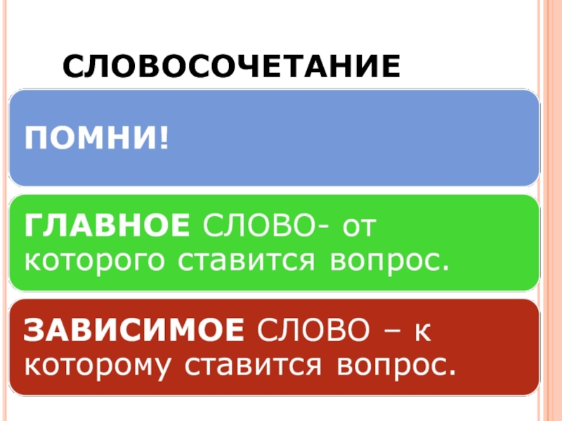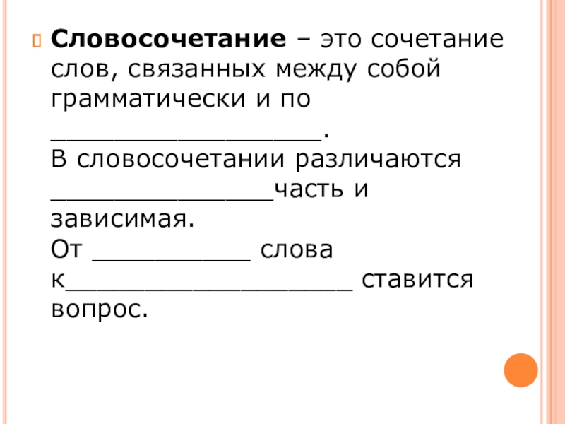 _________________. В словосочетании различаются ______________часть и зависимая. От __________ слова к__________________ ставится вопрос.