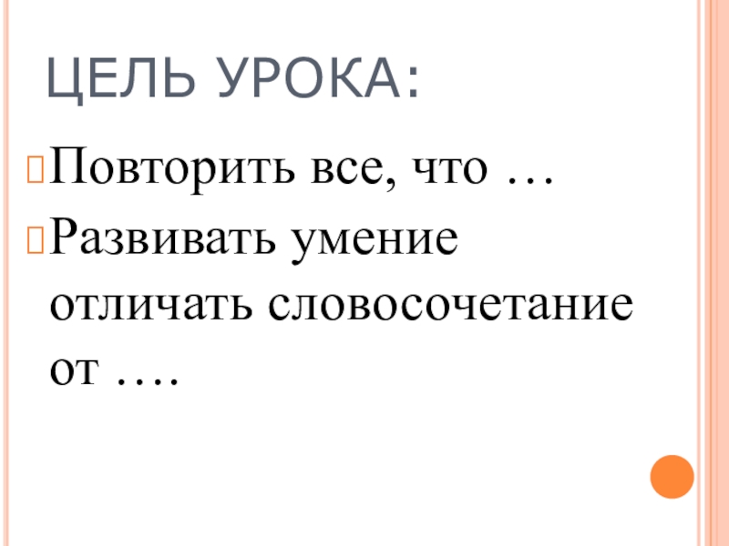 ЦЕЛЬ УРОКА:Повторить все, что …Развивать умение отличать словосочетание от ….