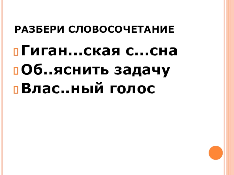 РАЗБЕРИ СЛОВОСОЧЕТАНИЕГиган...ская с...снаОб..яснить задачуВлас..ный голос