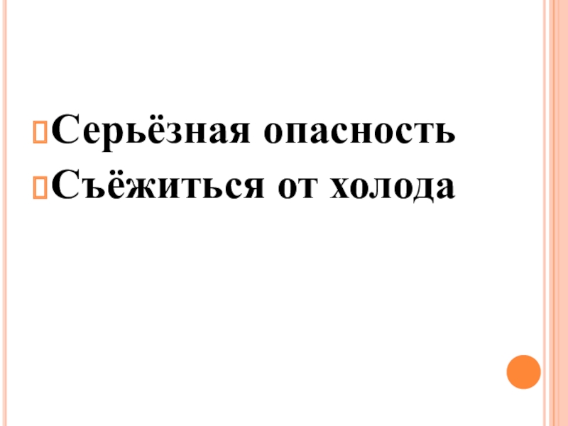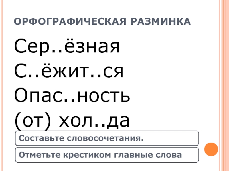 ОРФОГРАФИЧЕСКАЯ РАЗМИНКАСер..ёзнаяС..ёжит..сяОпас..ность(от) хол..да