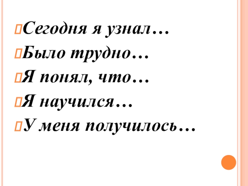 Сегодня я узнал…Было трудно…Я понял, что…Я научился…У меня получилось…