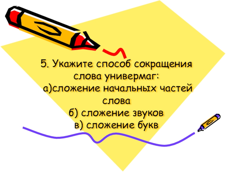 5. Укажите способ сокращения слова универмаг:  а)сложение начальных частей слова б) сложение звуков в) сложение букв