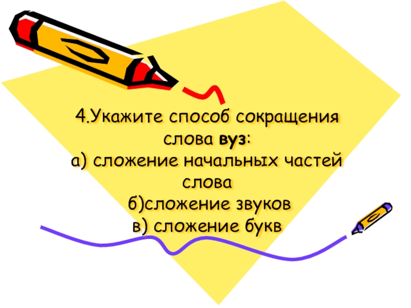 Слайд 5 4.Укажите способ сокращения слова вуз: а) сложение начальных частей слова  б)сложение звуков в) сложение букв