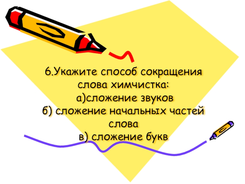 6.Укажите способ сокращения слова химчистка:  а)сложение звуков б) сложение начальных частей слова в) сложение букв
