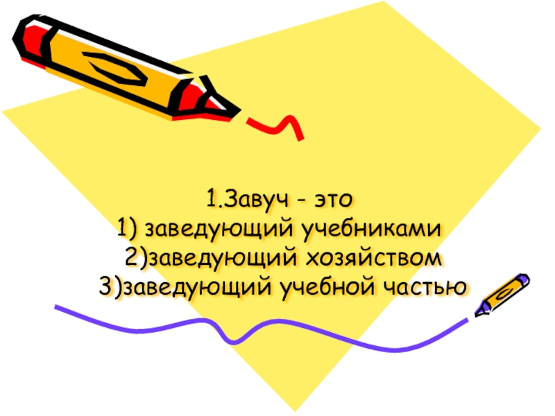 1.Завуч - это 1) заведующий учебниками  2)заведующий хозяйством  3)заведующий учебной частью