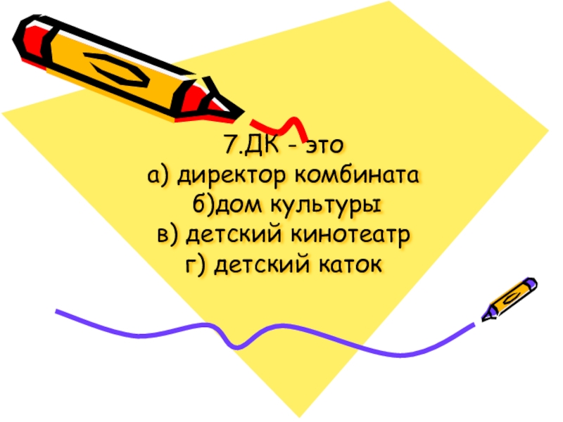 7.ДК - это а) директор комбината  б)дом культуры в) детский кинотеатр г) детский каток
