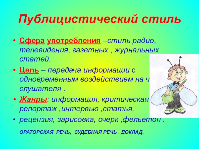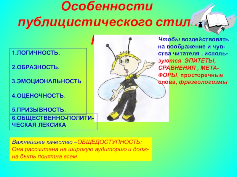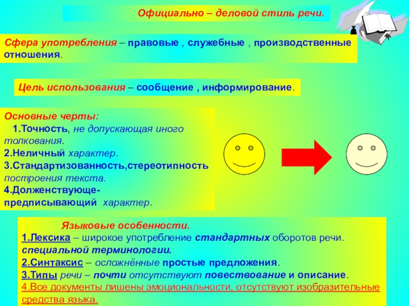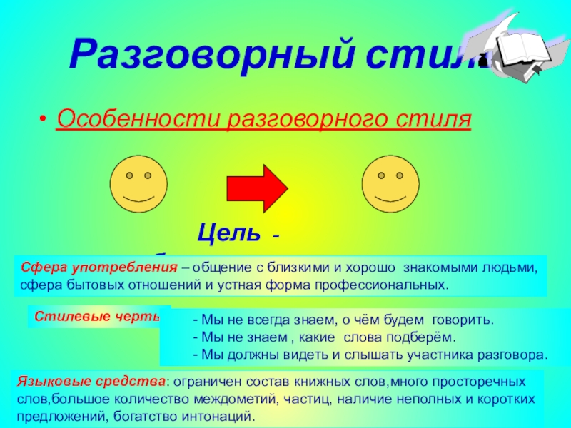 Языковые средства: ограничен состав книжных слов,много просторечных