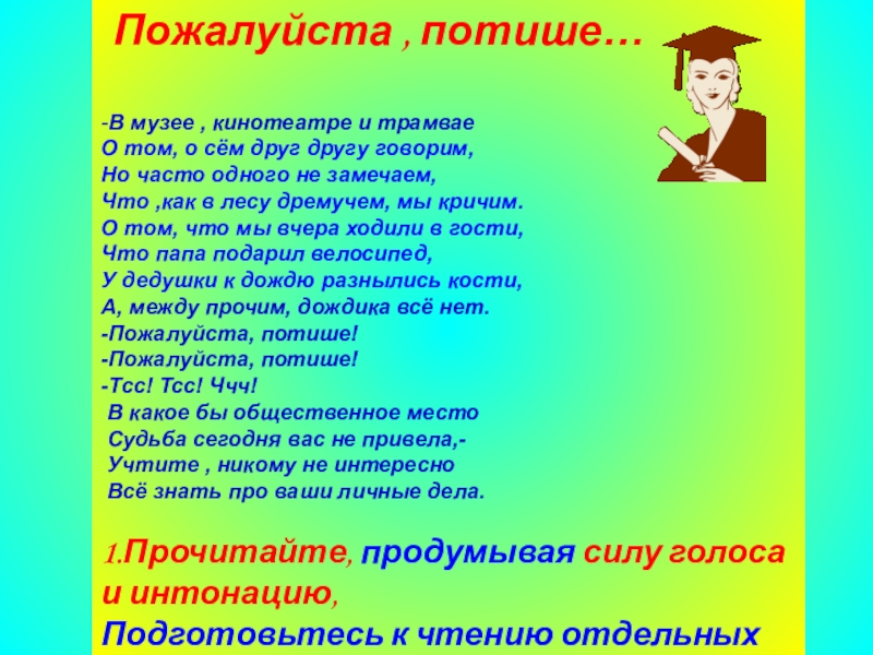 Варианты силы голоса : громко, слишком громко , шёпотом, тихо…
