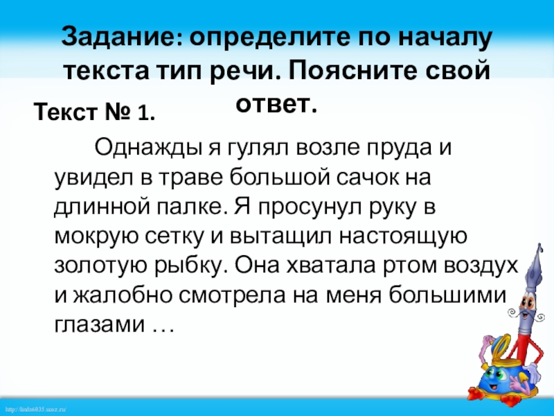 Слайд 10Задание: определите по началу текста тип речи. Поясните свой ответ.