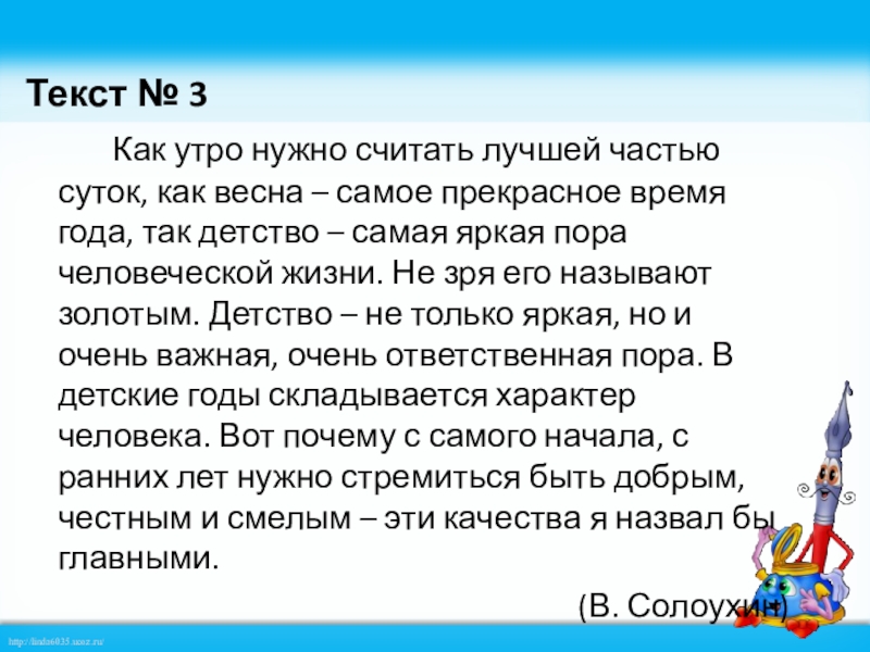 лучшей частью суток, как весна – самое прекрасное время года, так детство – самая яркая пора человеческой жизни. Не зря его называют золотым. Детство – не только яркая, но и очень важная, очень ответственная пора. В детские годы складывается характер человека. Вот почему с самого начала, с ранних лет нужно стремиться быть добрым, честным и смелым – эти качества я назвал бы главными.