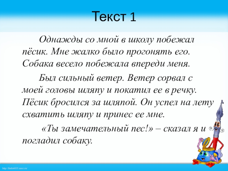 Был сильный ветер. Ветер сорвал с моей головы шляпу и покатил ее в речку. Пёсик бросился за шляпой. Он успел на лету схватить шляпу и принес ее мне.