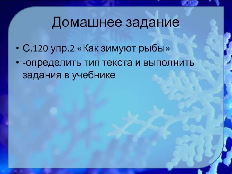 Домашнее заданиеС.120 упр.2 «Как зимуют рыбы»-определить тип текста и выполнить задания в учебнике