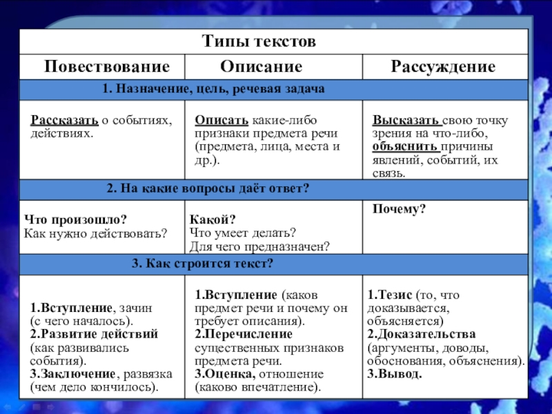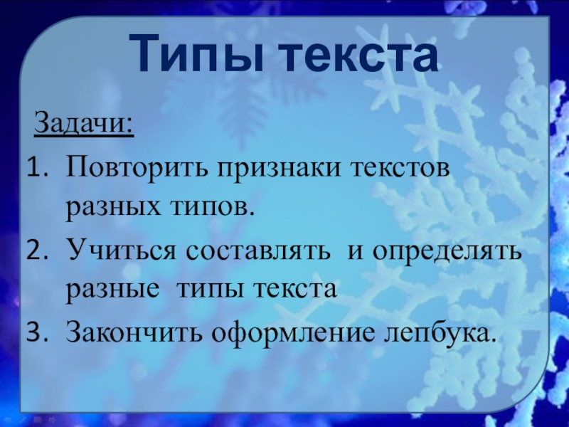 Типы текстаЗадачи:Повторить признаки текстов разных типов.Учиться составлять и определять разные типы текстаЗакончить оформление лепбука.