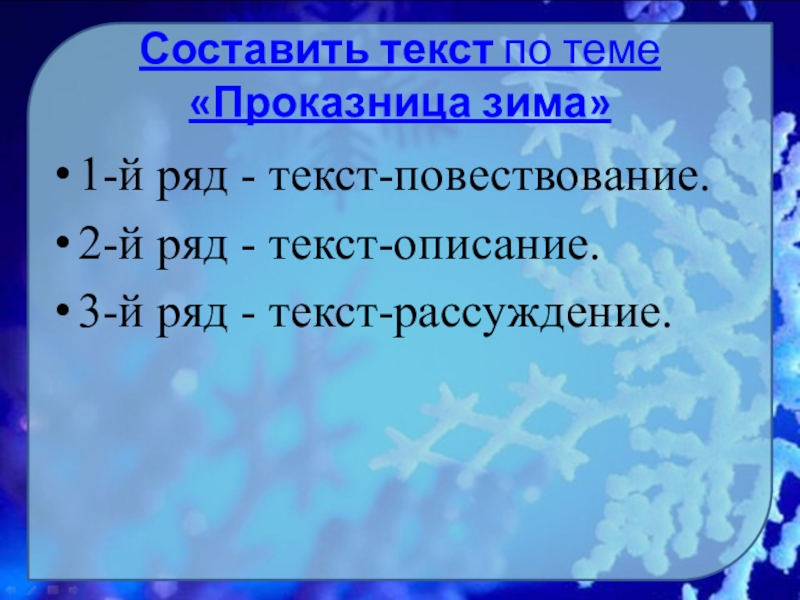 Составить текст по теме «Проказница зима»  1-й ряд - текст-повествование.2-й ряд - текст-описание.3-й ряд -