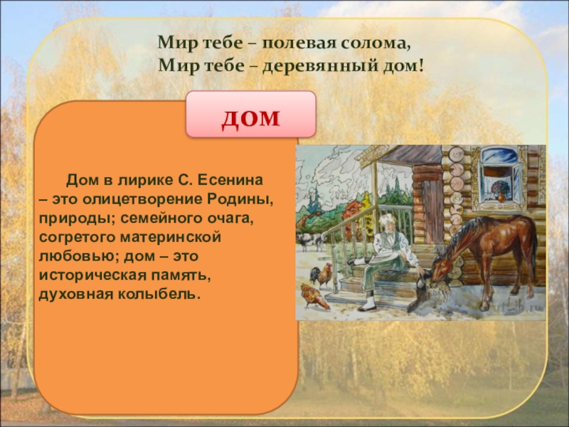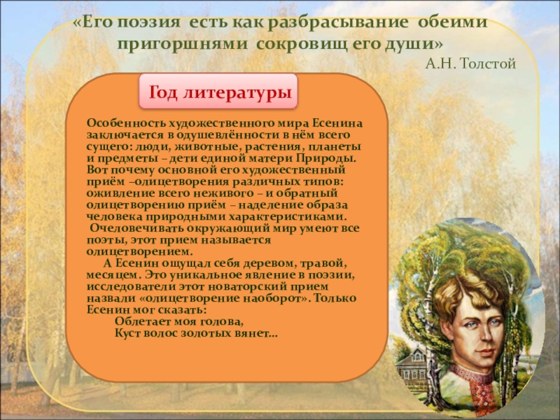 Особенность художественного мира Есенина заключается в одушевлённости в нём всего сущего: люди, животные, растения, планеты и предметы – дети единой матери Природы. Вот почему основной его художественный приём –олицетворения различных типов: оживление всего неживого – и обратный олицетворению приём – наделение образа человека природными характеристиками.