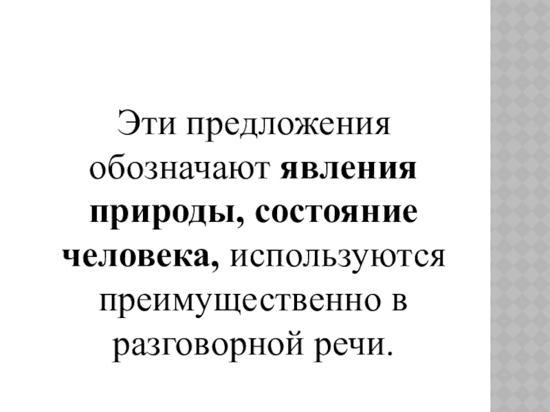 Слайд 6 Эти предложения обозначают явления природы, состояние человека, используются преимущественно