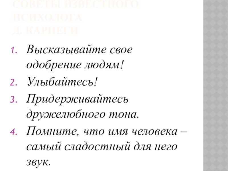 Советы известного психолога Д. КарнегиВысказывайте свое одобрение людям!Улыбайтесь!Придерживайтесь дружелюбного тона.Помните, что имя человека – самый сладостный для него звук.