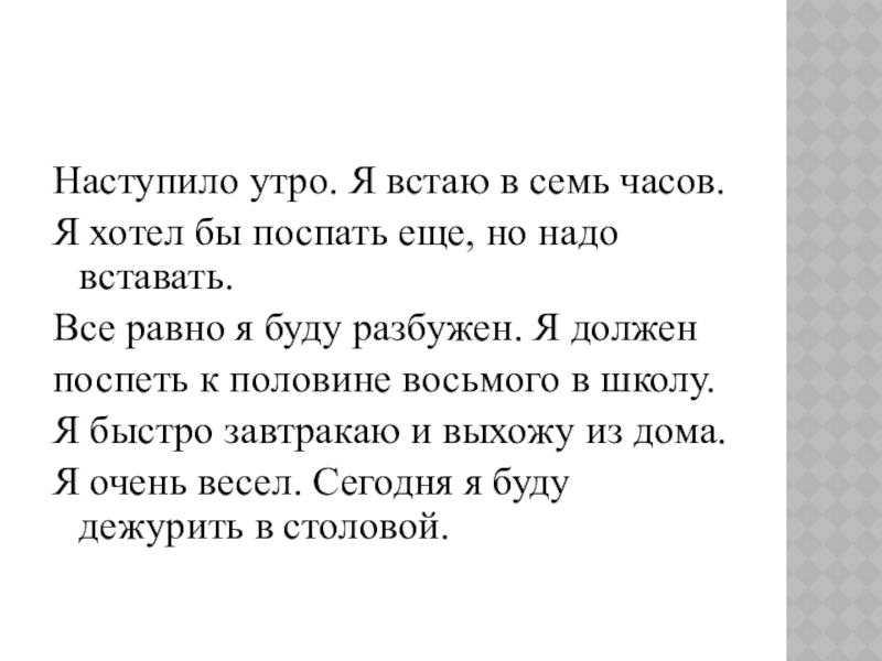 Слайд 10Наступило утро. Я встаю в семь часов.