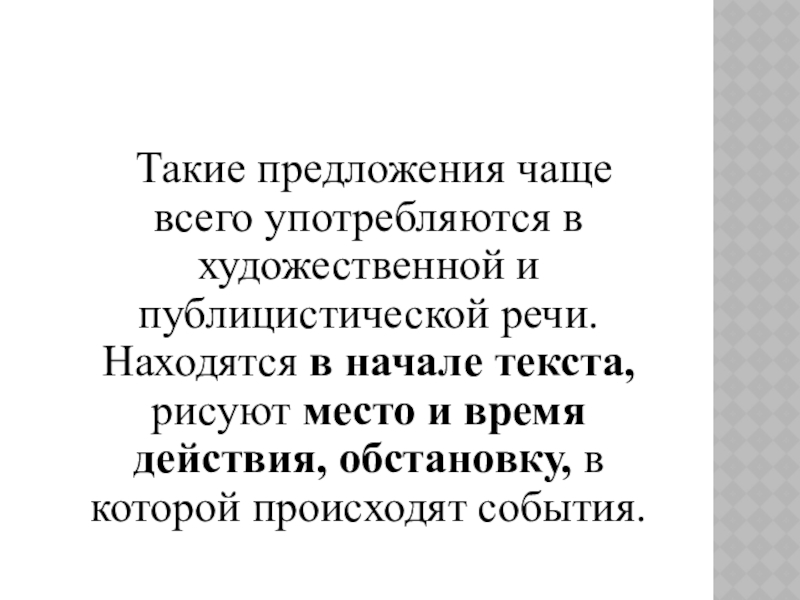 Такие предложения чаще всего употребляются в художественной и публицистической речи. Находятся в начале текста, рисуют