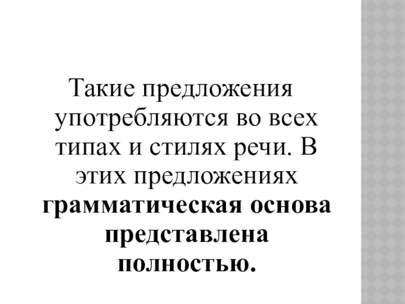 Такие предложения употребляются во всех типах и стилях речи. В этих предложениях грамматическая основа представлена полностью.