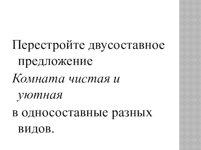Перестройте двусоставное предложениеКомната чистая и уютнаяв односоставные разных видов.
