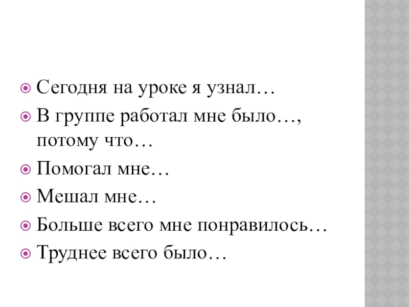 Сегодня на уроке я узнал…В группе работал мне было…, потому что…Помогал мне…Мешал мне…Больше всего мне понравилось…Труднее всего